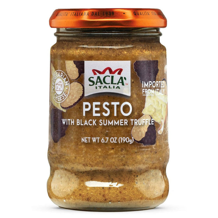 Indulge in the rich, earthy flavor of real Italian truffles with SACLA Pesto with Black Summer Truffle. This decadent pesto is made in Italy using authentic black summer truffles, aged cheese, and cashews for a velvety, umami-rich sauce that brings luxury to any dish. This non-traditional, basil-free pesto has no artificial flavors. It delivers pure, concentrated truffle flavor in a creamy, ready-to-use format. From SACLA - a family-owned Italian brand since 1939 - this gourmet truffle pesto is perfect for dressing pasta, spooning over eggs, spreading on crostini, or finishing meats and vegetables. Packed in a 6.7 oz glass jar, it’s shelf-stable until opened and ideal for both entertaining and everyday indulgence.