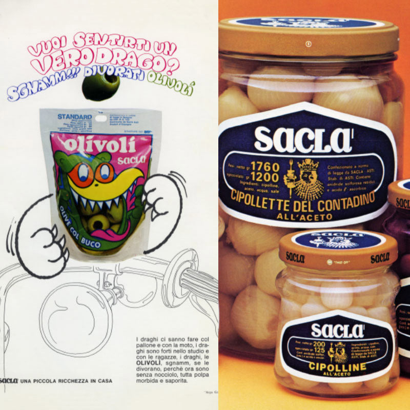 Saclà olives, Antipasti in oil and pickles vegetables became true icons in the 70s, when the company broke through on TV becoming one of the main protagonists of the Carosello, the first Italian advertising format. Unforgettable the famous jingle: "Olivolì, Olivolà, Olive Saclà!"